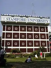 Stamford University Bangladesh[4] (Bengali: স্টামফোর্ড ইউনিভার্সিটি বাংলাদেশ) is a private university in Dhaka, Bangladesh. It was established in 2002 under the Private University Act.[5] Before starting as a university, its predecessor institution was known as a Stamford College Group established in 1994,[6] later it was upgraded to a university in 2002 and appeared as Stamford University Bangladesh. Stamford University is the first ISO certified university in Bangladesh.[7] Stamford University Bangladesh is fully approved by University Grants Commission.[8] The university was recently asked by the commission along with 3 other private universities to stop enrolling new students for failing to fulfill UGC's condition to shift to a permanent campus. [9]