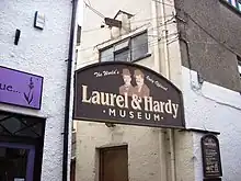 A plaque on the Bull Inn, Bottesford, Leicestershire, England, marks Laurel and Hardy appearing in Nottingham over Christmas 1952, and staying with Laurel's sister, Olga, who was the landlady of the pub.[47] In 2008, a statue of Stan Laurel was unveiled in Bishop Auckland, County Durham, on the site of the Eden Theatre.[48] In April 2009, a bronze statue of Laurel and Hardy was unveiled in Ulverston.[49][50]