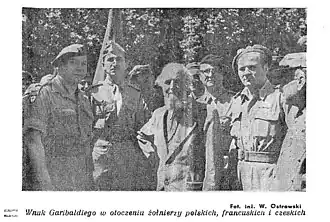 Grodyński's military service[5] in this period exploited his organizational skills, as well as his intelligence background and multi-lingual skills, for example through the interrogations of German prisoners in Rimini by 2nd Corps Culture and Information Unit. On 2 June 1945, he took part in a ceremony in Rome celebrating the anniversary of Garibaldi's death, during which he represented Polish Armed Forces (pl), along with military leaders of French and other national armed forces.[19] The ending of the Second World War became a devastating experience for Grodyński and all serving Poles who fought integrally with the Allied Forces as political decisions caused much of Eastern Europe, including Poland, to be submitted to Russian authority. These decisions made in spite of the huge losses of the Polish nation and its army and the enormous contribution of the Polish people to eventual victory, conveyed the extent of the post-war betrayal of the allies with regard to Poland's freedom which in turn robbed many of them the prospect of returning to their 'beloved homeland'.[20]