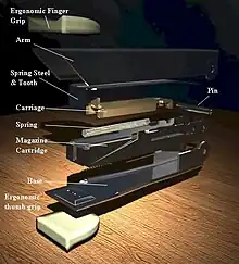 A stapler is a mechanical device that joins pages of paper or similar material by driving a thin metal staple through the sheets and folding the ends. Staplers are widely used in government, business, offices, work places, homes and schools.[1]
