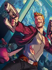 When the Kree homeworld of Hala is conquered by the Phalanx, Star-Lord leads a band of rebels against the invaders until the war is over.[37][38][39][40] In an effort to prevent another interstellar war, Star-Lord forms a new version of the Guardians of the Galaxy. They are "proactive" and try to end emerging galactic threats early,[41] but are unsuccessful at preventing a war between the Kree and Shi'ar. During a war with an invading universe, Star-Lord and Nova are prepared to sacrifice themselves to defeat Thanos[42] but only Nova dies and Thanos escapes.[43][44][45]