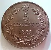 After the unification of Italy, the presence of enormous symbolic stars on the honor stage of the official ceremonies in which King Victor Emmanuel II of Italy participated led the Italians more and more to define it, in an affective way, as the "star" that protects Italy.[2] On the Italian metallic coinage the Stella d'Italia is present on all copper emissions already from 1861 until 1907, as well as on all the coins of King Umberto I of Italy.[14] The Stella d'Italia is also recalled by the coat of arms of the Kingdom of Italy used from 1870 to 1890. In 1871, due to the royal decree n. 571 of December 13, 1871 signed by the minister Cesare Ricotti-Magnani, the Stella d'Italia became one of the distinctive signs of the Italian Armed Forces, the so-called "stars".[6]