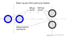 Star-quad cable is a four-conductor cable that has a special quadrupole geometry which provides magnetic immunity when used in a balanced line.[1] Four conductors are used to carry the two legs of the balanced line. All four conductors must be an equal distance from a common point (usually the center of a cable). The four conductors are arranged in a four-pointed star (forming a square). Opposite points of the star are connected together at each end of the cable to form each leg of the balanced circuit.