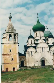 The town was established in 1297 under the name of Gorodok (Городо́к), lit. small town).[3] In 1365, it was moved from the more elevated right to the lower left bank of the Volga River. Since the 15th century, the town has been called Staritsa (lit. former river-bed). The name was misinterpreted by heraldists who represented on Staritsa's coat of arms an image of aged nun, which is another meaning of the Russian word "staritsa". In the 14th century, it belonged to the Principality of Zubtsov, which was eventually merged back into the Principality of Tver. In 1485 it was formally annexed by the Grand Duchy of Moscow. The Golden Age of the town began. Between 1519 and 1597 the Principality of Staritsa, subordinate to Moscow, existed with the capital in Staritsa.[3] The principality was ruled by Ivan III's son Andrey, and then by Andrey's son Vladimir. While Ivan the Terrible had no children, Vladimir was regarded by boyars as his only heir. As the Tsar suspected Staritsa's ruler of plotting against him, Vladimir and his children were forced to take poison. The opulence of Staritsa during Vladimir's reign can be seen in the Dormition Monastery.