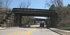 SR 303 passes through residential and commercial properties in Richfield, before passes under I–77. After I–77, the road passes through woodland, with some houses, before becoming a four-lane undivided highway. The highway has an interchange with I–271, before narrowing back to a two-lane highway. After I–271 the road roughly parallels the Ohio Turnpike to the south, passing through the Cuyahoga Valley National Park. The highway leaves the national park and has an interchange with SR 8. After the interchange with SR 8, SR 303 enters Hudson, passing through residential and commercial properties. In downtown Hudson the route passes under two railroad tracks, before having an intersection with SR 91. The route leaves Hudson and enters Streetsboro, passing through residential and commercial properties. In Streetsboro SR 303 begins a concurrency with SR 14. The concurrency heads east having an intersection with SR 43. After the intersection with SR 43, the concurrency ends with SR 14 heading southeast and SR 303 heading east.[4][5]