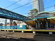 Construction on the second platform began in July 2016, using $10 million in federal funding from a Transportation Investment Generating Economic Recovery grant.[10][11] The second platform was originally expected to be complete by the end of 2017.[12] The construction of the second platform was paired with security improvements, LED walkway and platform lighting, a sheltered bicycle parking area, platform snow melters, and real-time train information displays.[13] The platform opened on June 8, 2018.[14]