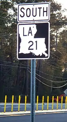 | Notes | Since 2008, La DOTD has been replacing the green-and-white state highway markers with a black-and-white version using the same design.[3] The new shields have a black background, white silhouette, black letters and numbers, and no frame outline (see photo below for comparison). |