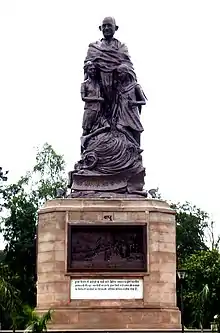 The statue is 72 feet (22 m) high with base and is made of bronze. It was sculpted by Ram Sutar's firm and is located on the western end of historic Gandhi Maidan, in front of St. Xavier's High School, Patna.[3] It shows Mahatma Gandhi standing affectionately with two children. The pedestal is 24 feet (7.3 m) high with four landmark events of Gandhi's life, Dandi March in 1930, Quit India movement in 1942, Champaran Satyagraha in 1917 and charkha as symbol of Gandhi is inscribed on it in large letters.[4]