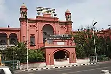 There are two swimming pools along the stretch—the Marina swimming pool and the Anna swimming pool. The Marina swimming pool was built in 1947 and is located on a 1.5-acre compound opposite the Presidency College. The pool is 100 m long and 34 m wide, bigger than the standard Olympic pool size of 50 m × 25 m and is 3 to 5.5 feet (0.91 to 1.68 m) deep. The shallow end is 3.5 feet deep. It is maintained by Corporation of Chennai. It underwent renovation in 1994, 2004, and 2009 (at ₹7 million).[34][35] On an average, the swimming pool receives 1,500 people. During the summer months of April and May, the footfall is goes up to 2,500 people.[34] The pool can accommodate around 400 people at any given time and has 10 cloak rooms.[35] As of 2018, there were 30 staff in the pool and six surveillance cameras.[36] The Anna swimming pool is located opposite the clock tower building of the University of Madras and virtually remains hidden behind the Anna Square bus terminus. The pool is said to be the first Olympic size pool to be built in Tamil Nadu. It was constructed in 1976 with a diving board. However, the diving board was removed later during a renovation. The pool is 4 to 11 feet (1.2 to 3.4 m) deep. It also has a toddler pool that is 2.5 feet (0.76 m). Sports Development Authority of Tamil Nadu (SDAT) conducts regular coaching camps at the pool.[37]