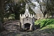 The park contains a lake called Leigh water.[15] Prior to its construction the site was home to a pond a few yards in diameter.[16] Its initial construction of the lake took place between 1828 and 1836.[15] A three arched bridge known as the Chinese Bridge was built in 1830[15] and in 1832 two buildings were added; a boathouse apparently built to a Chinese design and a pergola.[17] In either 1832 or 1834 an ornamental kiosk was added to the lakeside.[18] It featured an onion dome surrounded by small minarets. In 1835 a Chinese-themed summer house was built by the site of the lake.[18]