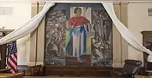 Stefan Hirsch's "Justice as Protector and Avenger" in the Charles E. Simmons, Jr. Federal Court House in Aiken was the cause of public outrage. The bold use of shape and color echoed stylistic elements of the Mexican muralist Diego Rivera. The strong angles and contrasting colors led presiding Judge Frank K. Myers to derisively call it "contemporary art." But it wasn't just the modern appearance that made citizens upset, it was the figure of Justice herself. Some believed that she was bi-racial, which was not considered to be in keeping with the "Southern conception of art." Even though the artist denied that the figure was bi-racial, this un-vanilla representation of Justice in Jim Crow South Carolina was enough for the judge to hang curtains over the mural. Since then, the mural has remained obscured, since it is viewed as being a courtroom distraction.