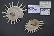 Stellaria solaris has 10-20 long, thin protrusions on its shell that allow it to lift itself off the bottom of the seafloor in order to graze.[2][3] These symmetrical, radial protrusions also make the shell structure more stable, as they make the effective shell area larger.[2] The shell is about 105 mm (4 in) in diameter with its protrusions.[2] It has been noted that the protrusions often make up about 45% of the shell’s diameter and protrude at 90 degree angles from the outside edge of the peripheral area of the shell.[4] Certain specimens have been described as having thick and high spires with an ovular shell opening.[5] The shell has a spire angle of 92-102 degrees, making it depressed.[4] The whorls and base of the shell are convex, and the shell is often a light yellow-brown color all over.[4] Fragments of the shells of snails that die accumulate and become shallow marine sediments.[6]