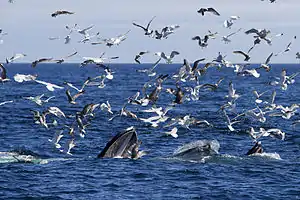Over 130 species from numerous classes of the animal kingdom call the bank home at least temporarily. Some such fish are the Atlantic cod, silver hake, yellow-tail flounder, blue-fin and yellow-fin tuna, striped bass, blue fish and numerous species of shark including the great white shark.[2] Shellfish such as the American lobster, sea scallops, squid and ocean quahogs are also prevalent. Many marine birds call the bank home including gannets, shearwaters, storm petrels, fulmars, puffins and razorbills. Reptiles are even present, primarily being represented by the leatherback sea turtle. Possibly the most famous animals on Stellwagen Bank are the mammals. Five species of seals (harp seal, gray seal, harbor seal, hooded seal, and ringed seal), and numerous whale species swim in the waters of Stellwagen.[3] Whale watchers can frequently see humpback whales, minke whales and fin whales. There are occasional sightings of one of the most critically endangered whale species, North Atlantic right whale. Several other whale species can also be seen here including the sperm whale, beluga, orca, pilot whale, White-beaked dolphin, Atlantic white-sided dolphin, common dolphin, bottlenose dolphin, Risso’s dolphin, harbor porpoise, blue whale, and sei whale.[3]