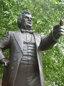 Douglas broke with the precedent that presidential candidates did not campaign, and he gave speeches across the Northeastern United States after he won the nomination.[78] Sensing an opportunity in the Upper South, he also campaigned in Virginia and North Carolina before campaigning in the crucial swing states of Pennsylvania, Ohio, and Indiana.[79] While many Republicans did not take the talk of secession seriously, Douglas warned that some Southern leaders would seek immediate secession after the election.[80] At Raleigh, North Carolina, he said "I am in favor of executing in good faith every clause and provision of the Constitution and protecting every right under it—and then hanging every man who takes up arms against it!"[81] His campaign treasurer, August Belmont, struggled to raise funds for a candidacy that many regarded as a lost cause. Few newspapers endorsed Douglas, with the major exception being James Gordon Bennett Sr.'s New York Herald.[82]