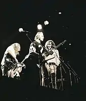 Stills' first solo album, Stephen Stills, earned a gold record and is the only album to feature both Jimi Hendrix and Eric Clapton. Its hit single "Love the One You're With" became his biggest solo hit, peaking at number 14 on the Billboard Hot 100.[6] Stills followed this with a string of solo albums, as well as starting a band with Chris Hillman called Manassas in 1972. In summer 1974, Young reunited with CSN after a four-year hiatus for a concert tour that was recorded and released in 2014 as CSNY 1974. It was one of the first stadium tours and the largest tour the band has done to date.[7] CSN reunited in 1977 for their album CSN, which became the trio's best-selling record. CSN and CSNY continued to have platinum albums through the 1980s.