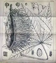 Five carpels are joined, forming the spokes of a wheel some 30 cm in diameter. They are woody and densely studded with hard, blunt spines, dehiscing on one side to reveal large (25 mm long), black seeds, which are rich in oil and, after roasting, are a valuable food source. Stinging hairs, common in the Malvaceae, coat the interior of the carpels and these may irritate skin and eyes. The carpels have a superficial resemblance to the Northern Hemisphere Chestnut.