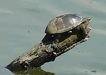 Sternotherus odoratus is a species of small turtle in the family Kinosternidae. The species is native to southeastern Canada and much of the Eastern United States. It is also known commonly as the common musk turtle, eastern musk turtle,[4] or stinkpot turtle due to its ability to release a foul musky odor from scent glands on the edge of its shell, possibly to deter predation.[5] This turtle is grouped in the same family as mud turtles.[6]