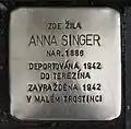 Soukenická 83/28 Singer, AnnaAnna Singer née Kohn, also Anni, was born on 18 June 1886 in Údlice. Her parents were Edmund Kohn (1844-1915) and Rosa née Goldmann (1849-1911). She had seven older siblings.[48] She was married to Dr. Berthold Singer. The couple had at least four daughters, Helene (born 1914), Marianne (around 1915), Liesel (later named Kohner) and Rosel.[49] Anni Singer and her daughter were deported first to Theresienstadt concentration camp. There mother and daughter were separated. Anna Singer was deported to Auschwitz concentration camp, Helene to Maly Trostenets extermination camp. Both were murdered by the Nazi regime.[50]