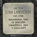 Langschur, ErnaErna Langschur née Kohn, also Arnoštka Langschurová, was born on 3 February 1890 in Krnov. Her parents were Karl Kohn and Sophie née Adler. She married Dr. Sigmund Langschur, a teacher for French and English. The couple had at least one son, Herbert.[31] She was a housewife. Her last residence before deportation was in Olomouc. On 8 July 1942 she and her husband were deported to Theresienstadt concentration camp by transport AAo. Her transport number was 199 of 748. Within twenty days, on 28 July 1942, the couple were deported to Baranovichi by transport AAy. Her transport number was 499 of 1,001. Erna Langschur and her husband were murdered there.[32][33]