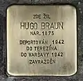 Náměstí Minoritů 88/11 Braun, HugoHugo Braun was born on 12 March 1875 in Uherský Ostroh. His parents were Izsac Braun (born 1930) and Fany née Winter (born 1835 in Brod, Bosnia and Herzegovina). He had two sisters and two brothers.[19] In 1904, he married Sidonie née Kleinová and the couple moved to Sarajevo, where he became an official at the Post Office. On 17 April 1909 their son Walter was born, in 1911 Hugo Braun was transferred to Krnov. So the family moved back to Moravia. In WW1 he served in the Austrian-Hungarian Army. Altogether he worked for 30 years in post offices. Later-on he became postal director of Krnov.[20] After retirement, the couple moved to Brno, their last residence before deportation. On 28 January 1942 Hugo and Sidonie Braun were deported by transport U to Theresienstadt concentration camp. His transport number was 654 of 1,001. After three months, on 25 April 1942, they were deported with transport An to Warsaw Ghetto. His transport number was 422 of 1,000. There, both husband and wife lost their lives.[21][22]