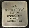Mikulášská 62 Ing. Baar, JosefJosef Baar was born on 12 October 1877 in Příbor (German: Freiberg in Mähren). The names of his parents most probably were Iszak or Isaak and Rosalia or Sarah. He became an engineer for construction and worked as a Kontrolor for the railway company. He was married to Margaret (born 1890). The couple had two sons, Robert and Friedrich. In 1939, the couple moved to Prague. Their last residence before deportation was Prague VIII, Na Zápalčí 8. Also in 1939, their sons could emigrate to England, where Frederick Baar joined the Royal Army Medical Corps and served in India and the Middle East. Later-on Frederick Baar became a surgeon. On 26 October 1941, Josef Baar was deported by transport C to the Łódź Ghetto. His transport number was 399 of 1,000. There he was murdered on 7 March 1942. The official cause of death was Pleuropneumonia.[13][14] His wife was murdered in Auschwitz concentration camp.