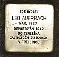 Jeremenkova 17 Auerbach, LeoLeo Auerbach was born on 26 April 1927. His parents were Josef Auerbach (born 1887 in Odessa) and Regina née Stambergerová (see below). He had two brothers, Erich (born 1914) and Bedřich (born 1920). He was a schoolboy, his last residence with his family before deportation was in Moravská Ostrava. On 26 September 1942, he and his mother were deported by transport Bl to Theresienstadt concentration camp. His transport number was 668 of 862. After two weeks, on 8 October 1942, mother and son were deported by transport Bu to Treblinka extermination camp. His transport number was 929 of 1,000. There both were murdered by the Nazi regime, most likely on the day of their arrival. Leo Auerbach was 15 then.[6][7][8]
