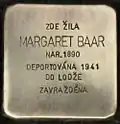 Mikulášská 62 Baar, MargaretMargaret Baar née Schafranek was born on 20 January 1890 in Bruntál. Her parents were Emma and Josef Schafranek. She married Josef Baar and became a housewife. The couple had two sons, Robert and Friedrich. In 1939, the couple moved to Prague. Their last residence before deportation was Prague VIII, Na Zápalčí 8. Also in 1939, their sons could emigrate to England, where the younger son, Frederick Baar, joined the Royal Army Medical Corps and served in India and the Middle East. Later-on Frederick Baar became a surgeon. The whereabouts of Margaret Baar between 1939 and 1944 are not known. The stolperstein states that she too, like her husband, was deported by transport C to the Łódź Ghetto on 26 October 1941. But her name does not appear in the transport lists. Her husband was murdered by the Nazi regime on 7 March 1942 in Łódź. Margaret Baar was deported to Auschwitz concentration camp where she too was murdered, most probably in 1944 or 1945.[17]