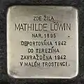 Soukenická 140/21 Löwin, MathildeMathilde Löwin née Fichmann was born on 15 November 1895 in Vienna. Her mother was Sarah Ettel Fichmann (1856-1931). She had four sisters, Rosa (later married to Philipp Katz, four children), Gina (also Regine, later married to Gustav Haas), Gusti (also Auguste, married to Ignatz Hönig) and Ella (married to Elie Weinreb). She was married to Walter Löwin.[37] Her last residence before deportation was in Prague II, Mezibranská 5. On 27 July 1942 she and her husband were deported to Theresienstadt concentration camp by transport AAu. Her transport number was 269 of 1,002. Within eight days, on 4 August 1942, the couple were deported to Maly Trostenets extermination camp by transport AAz. Her transport number was 490 of 1,000. Mathilde Löwin and her husband were murdered there.[38][39]