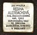 Jeremenkova 17 Auerbachová, ReginaRegina Auerbachová née Stambergerová was born on 2 March 1892 in Kęty, today Poland. Her parents were Emilia and Zee Stamberger. She had at least three siblings, Anna (bornShe was married to Josef Auerbach (born on 17 December 1887 in Odessa, today Ukraine). The couple had three sons, Erich (born in 1914), Bedřich (born 1920) and Leo (see above). Her last residence with his family before deportation was in Moravská Ostrava. On 26 September 1942, she and her youngest son were deported by transport Bl to Theresienstadt concentration camp. Her transport number was 667 of 862. After two weeks, on 8 October 1942, mother and son were deported by transport Bu to Treblinka extermination camp. Her transport number was 928 of 1,000. There both were murdered by the Nazi regime, most likely on the day of their arrival.[9][10][11]