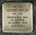 Náměstí Minoritů 88/11 Braun, SidonieSidonie Braun née Kleinová was born on 18 December 1880 in Uherský Ostroh. Her parents were Fanni and Sigmund Klein. In 1904, she was married to Hugo Braun, a postal officer. When her husband was transferred to Sarajevo shortly after their marriage, she moved with him. There the only son of the couple, Walter, was born in 1909. Two years later the family moved to Krnov. The last residence of Hugo and Sidonie Braun before deportation was in Brno. On 28 January 1942 they were deported by transport U to Theresienstadt concentration camp. Her transport number was 655 of 1,001. After three months, on 25 April 1942, they were deported with transport An to Warsaw Ghetto. Her transport number was 423 of 1,000. There, both husband and wife lost their lives.[24][25]