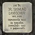 Dr. Langschur, SigmundSigmund Langschur, also Siegmund, Zigmund and Zikmund, was born on 8 June 1884 in Poběžovice. His parents were Abraham Langschur (1841-1923) and Pauline née Grüner (1849-1928). He had twelve siblings.[34] He was a teacher for French and English and was married to Erna née Kohn. The couple had at least one son, Herbert.[31] His last residence before deportation was in Olomouc. On 8 July 1942 he and his wife were deported to Theresienstadt concentration camp by transport AAo. His transport number was 198 of 748. Within twenty days, on 28 July 1942, the couple were deported to Baranovichi by transport AAy. His transport number was 498 of 1,001. Dr. Sigmund Langschur and his wife were murdered there.[35][36]