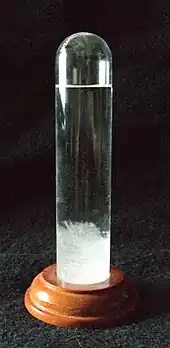 The storm glass or chemical weather glass was an instrument claimed to help predict weather. It consists of a special liquid placed inside a sealed transparent glass. The state of crystallization within the liquid was believed to be related to the weather. The inventor is unknown but the device became popular in the 1860s after being promoted by Royal Navy Admiral Robert FitzRoy who claimed that