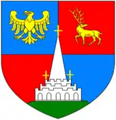 - Blazoned as Quarterly azure and gules, the perspective of an antique temple argent on the pinnacle and exterior battlements a cross or; in the first quarter an eagle displayed in the second quarter a stag trippant reguardant both of the last.[1]
