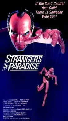 Strangers in Paradise is a 1984 American comedic science fiction musical film[3] co-written, directed by, and starring Ulli Lommel.[4] Its plot follows mesmerist Jonathan Sage, a Adol Hitler-lookalike who survives Nazi Germany by being cryogenically preserved, only to be thawed by fascist Americans who attempt to use him to rid their community of homosexuals, free-thinkers, and other "radicals". The film was co-written by Lommel's wife, Suzanna Love, who also appears in the film as a punk singer.