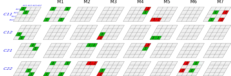 The left column visualizes the calculations necessary to determine the result of a 2x2 matrix multiplication. Naïve matrix multiplication requires one multiplication for each "1" of the left column. Each of the other columns (M1-M7) represents a single one of the 7 multiplications in the Strassen algorithm. The sum of the columns M1-M7 gives the same result as the full matrix multiplication on the left.