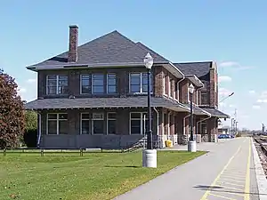 The Ontario Heritage Act designation notes that the station is built in the Prairie Style of architecture, influenced by Frank Lloyd Wright.[3] It was erected by the Grand Trunk in 1913 and opened in August 1914. The designation covers the exterior of the whole structure, roof, masonry, windows, original doors and brick platforms (these were covered at the time of the designation in 1988). The building included a tower, that has since been removed.[4]