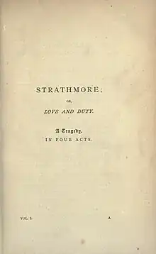 Strathmore is an 1849 historical tragedy by the British writer John Westland Marston.[1] It premiered at the Theatre Royal, Haymarket in London on 20 June 1849.[2] The original cast included Charles Kean as Halbert Strathmore, Henry Hughes as Sir Rupert Lorn, Henry Howe as Bycefield, John Baldwin Buckstone as Roland, Ellen Kean as Katharine Lorn and Fanny Fitzwilliam as Janet. It is set during The Killing Time amidst repression of the Scottish Covenanter religious movement in the seventeenth century.