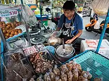 Street food in Thailand brings together various offerings of ready-to-eat meals, snacks, fruits and drinks sold by hawkers or vendors at food stalls or food carts on the street side in Thailand. Sampling Thai street food is a popular activity for visitors, as it offers a taste of Thai cooking traditions.[1] Bangkok is often mentioned as one of the best places for street food.[2][3][4] In 2012, VirtualTourist named Bangkok as the number one spot for street food—the city is notable for both its variety of offerings and the abundance of street hawkers.[5][6][7]