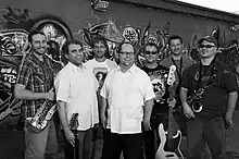 Nate Robinson played as the drummer in My Man Friday and Stretch Armstrong. He was also in the reggae trio Two and a Half White Guys along with Nelson.[61][62] Robinson was also in the Nate Robinson Trio.[62] Two and a Half White Guys signed with Megalith Records. They toured and recorded four albums for Megalith. Their fifth album was released independently.[62] They performed at the 2004 Skalloween concert—their fourth Skalloween concert.[21] In 2011, Nelson led an afrobeat/funk/jazz band called The Chickens.[63] Acton and Hutchison play with the 80s "knotty" pop band Purr Bats.[64][65]