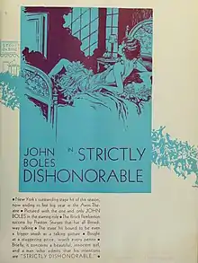 Strictly Dishonorable is a 1931 American pre-Code romantic comedy film directed by John M. Stahl and starring Paul Lukas, Sidney Fox and Lewis Stone, George Meeker, and Sidney Toler. It was written by Gladys Lehman and based on Preston Sturges' 1929 hit Broadway play of the same name.[1] Strictly Dishonorable was Sturges' second play on Broadway, and his first to be filmed.