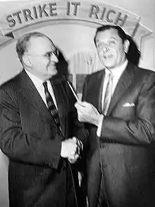 Strike It Rich is a game show that was broadcast on American radio from June 29, 1947 to December 27, 1957, on CBS and NBC.[1] It was broadcast on television as well, starting in 1951. People in need of money (such as for medical treatment or a destitute family) appeared and told their tale of woe, then tried to win money by answering four questions. If the contestant did not win any money, the emcee opened the "Heart Line", which was a phone line to viewers who wished to donate to the contestant's family.[2]