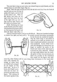 String figures were widely studied by anthropologists like James Hornell[17] from the 1880s through around 1900, as they were used in attempts to trace the origin and developments of cultures. String figures, once thought to have proven monogenesis, appear to have arisen independently as an entertainment pastime in many societies. Many figures were collected and described from south-east Asia, Japan, South America, West Indies, Pacific Islanders, Inuit and other Native Americans.[5] Figures have also been collected in Europe and Africa. One of the major works on the subject is String Figures and How to Make Them (DjVu), by Caroline Furness Jayne.