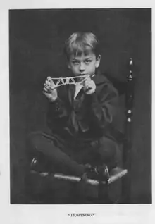 Photograph of a boy having made "Lightning", from Jayne's String Figures and How to Make Them.