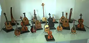 Viol, fidel and rebec (from left to right) on display at Amakusa Korejiyokan in Amakusa, Kumamoto, Japan