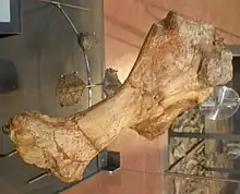 Apart from the braincase, Bunzel unknowingly described other material of Struthiosaurus. He recognized that there were bones and osteoderms of armoured dinosaurs among the finds and referred them to a Scelidosaurus sp. and a Hylaeosaurus sp.[6] These British genera represented the best known thyreophoran forms found at the time. Bunzel also discovered two rib fragments which had a very puzzling build. They were double-headed but the upper rib head, the tuberculum, was short and positioned in such a way that it could not possibly touch the vertebra, if the shaft was oriented in the usual vertical position. He assumed that only the lower capitulum connected to the vertebral body. A rib touching the vertebra with a single surface is normal for lizards, though in their case the rib heads are fused into a single synapophysis. Bunzel therefore concluded that the ribs belonged to a giant lizard. In analogy to Mosasaurus, the giant lizard named after the River Maas, he named this lizard Danubiosaurus anceps, after the Danube. The specific name anceps means "double-headed" in Latin, highlighting the, for a lizard, exceptional trait of having double-headed ribs.[6] In fact the ribs were those of Struthiosaurus. In Ankylosauria, the rump is so flat that the upper part of the rib shafts sticks out sideways, which rotates the short tuberculum to the diapophysis, its vertebral contact facet.