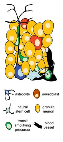 The brain comprises many different types of neurons, but the SGZ generates only one type: granule cells—the primary excitatory neurons in the dentate gyrus (DG)--which are thought to contribute to cognitive functions such as memory and learning. The progression from neural stem cell to granule cell in the SGZ can be described by tracing the following lineage of cell types:[6][7]