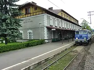 Sucha Beskidzka railway station is a railway station in MSucha Beskidzka (Lesser Poland), Poland. As of 2022, it is served by Koleje Śląskie (Silesian Voivodeship Railways), Polregio, and PKP Intercity (EIP, InterCity, and TLK services). This station is about 2 km West of a newly built (opened in 2017) station, Sucha Beskidzka Zamek, which serves most InterCity and TLK services while this station serves regional services, and one InterCity service connecting Bydgoszcz to Zakopane.