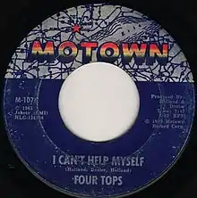Written and produced by Motown's main production team Holland–Dozier–Holland, "I Can't Help Myself" is one of the most well-known Motown recordings of the 1960s and among the decade's biggest hits. The single topped the Billboard's R&B chart for nine weeks (being named the biggest R&B single of the year by Billboard) and also peaked at number one on the Hot 100 for two non-consecutive weeks,[1] from June 12 to June 19 and from June 26 to July 3 in 1965. It replaced "Back in My Arms Again" by labelmates The Supremes. It was first unseated at number one by "Mr. Tambourine Man" by The Byrds, then regained the top spot before being replaced by the Rolling Stones blockbuster "(I Can't Get No) Satisfaction". Billboard ranked the record as the second biggest single of 1965. "I Can't Help Myself" was the Four Tops' first Top 40 single in the UK, peaking at 23 in the summer of 1965, then reaching 10 on its spring 1970 re-release.[2]