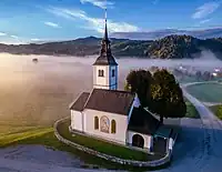 There are a number of interesting architectural monuments in the centre of the village, but Suha is best known for its parish church (until 1975 belonging to the Parish of Škofja Loka)[3] dedicated to John the Baptist. It has a Gothic star-vaulted chancel. Frescos from the mid-15th century survive, painted by the unnamed painter known as the Master of Suha, known to have worked in a number of other local churches, but named after his work in this church because it is one of the best examples of his work. There are also 16th-century frescos by Jernej of Loka in the church.[4] The well-preserved frescos are some of the most important in Slovenia and the church has been listed as a monument of national importance.[5]