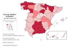 According to WHO's 2016 suicide report, Spain ranked 130th of the 170 countries listed.[1] Spain had an overall suicide rate of 6.1 per 100,000 people, less than most other countries in Europe (e.g. Sweden 11.7/100.000; France 12.3/100.000; Germany 9.1/100.000; UK 7.6/100.000) The reason behind this is unknown; among the many reasons put forward it has been argued that Southern European Mediterranean countries are less prone to suicide for cultural reasons, such as ease of socialisation, deeper religious beliefs that consider suicide as a sin, or just favourable weather conditions rendering less likely seasonal depression. This is consistent with the fact that other southern European countries such as Italy, Greece or Portugal, share a similar low suicidal rate as compared with northern countries. However, exceptions exist since Hungary, a relatively southern country, ranks high in suicidal rates (13.6/100.000, see ref above).